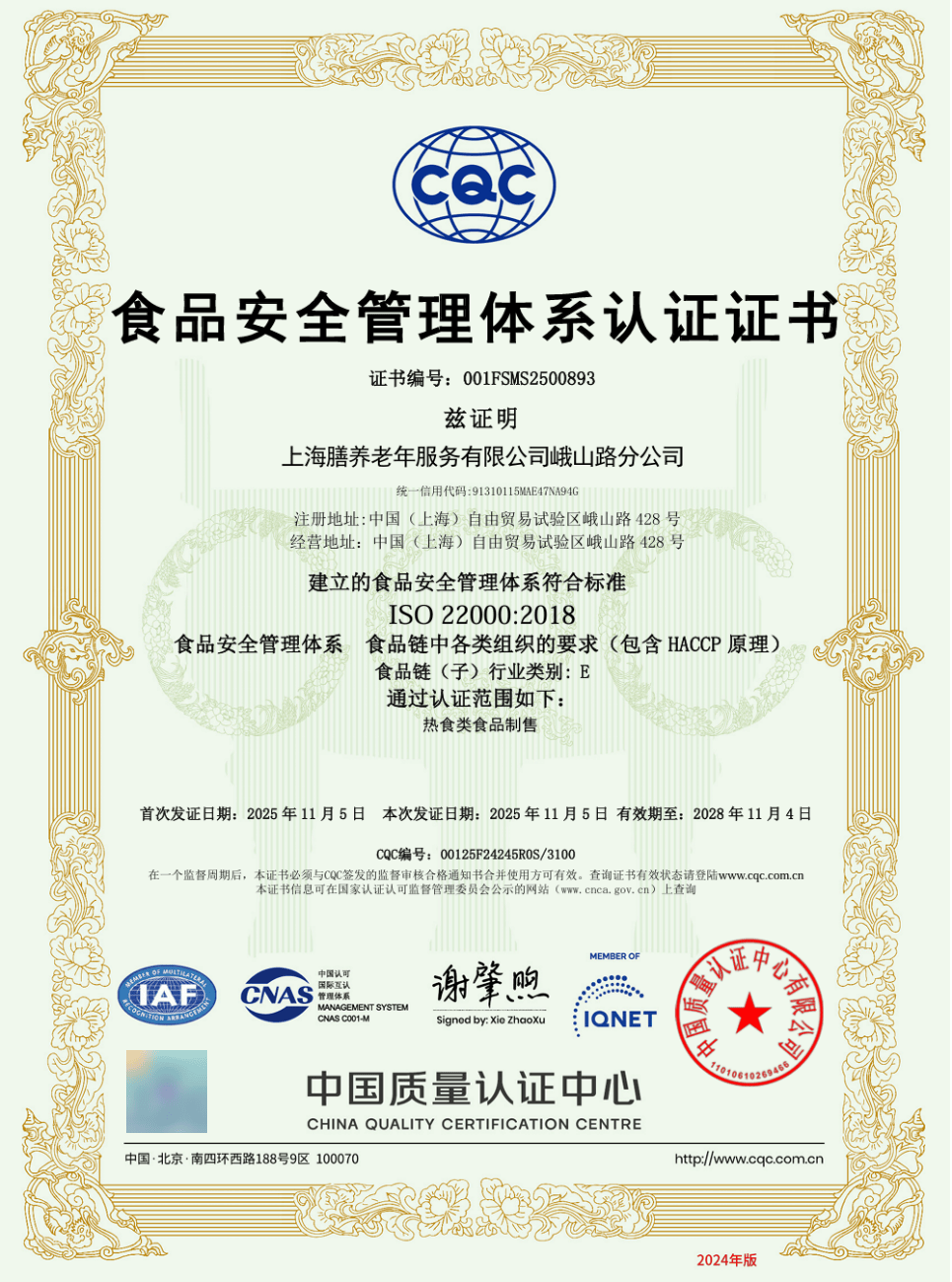 历时近7个月的勤奋,康养集团所属峨山社区食堂近日通过了食物平安办理系统认证,获得中国质量认证核心(CQC)颁布的认证证书。峨山社区食堂正式成为康养集团旗下首家通过ISO22000认证的餐饮门店。